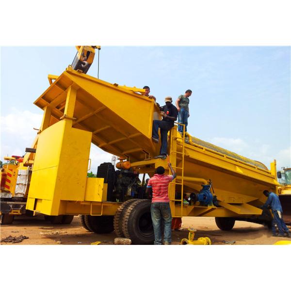 Potable gold mining trommel wash plant are mainly used for gold dust recovery. It is composed by feeder hopper, scrubbing canister, nonaxle trommel, chute, shaking chute, centrifugal machine, etc. The mobile trommel screen is a optimized removable platform for gold recovery, applicable to small or medium scale of placer gold ore processing that need mobile operation. The gold dust ore processing capacity is 40 to 500 tons per hour.
